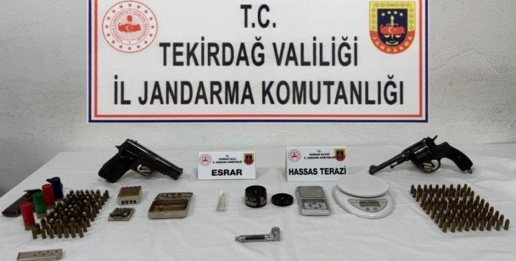 Tekirdağ İl Jandarma Komutanlığı tarafından uyuşturucu madde imal ve ticareti, yasadışı kenevir ekimi, ruhsatsız silah ve 6136 Sayılı Kanun'a muhalefet suçlarına yönelik il genelinde son bir haftada operasyonlar düzenlendi. Adreslerde yapılan aramalarda 2 kilo 496 gram bonzai, 378 gram skunk, 30 gram Afyon sakızı, 25 gram eroin, 20 gram metamfetamin, 160 mililitre amfetamin, 14,20 gram skunk tohumu, 9 gram kubar esrar, 2 gram toz esrar, 3 gram kenevir tohumu, 97 adet extacy hap, 35 kök iklimlendirme yöntemiyle yetiştirilen skunk bitkisi, 3 adet dijital hassas terazi, 3 adet uyuşturucu içme aparatı, 2 adet öğütme aparatı, 50 adet kilitli poşet, 1 adet dijital termometre, 1 adet iklimlendirme çadırı, 1 adet fan, 2 adet vantilatör, 2 adet aydınlatma lambası, 1 adet 3 metrelik seyyar kablo, 5 metre havalandırma borusu, 6 adet plastik saksı, 19 litre bitki besleyici gübre, 2 adet tabanca, 1 adet 9 mm, 1 adet 7.65 mm, 1 adet 6.35 mm şarjör, 40 adet 9 mm, 45 adet 7.65 mm, 114 adet 6.35 mm fişek, 10 adet kurusıkı fişek, 4 adet av tüfeği fişeği, 5 bin 525 TL ve 5 bin 660 TL olmak üzere toplam 11 bin 185 TL suçtan elde edildiği değerlendirilen para, 300 ABD doları ile 5 adet cep telefonu ele geçirildi. Düzenlenen operasyonlarda bir evdeki bez kıyafet dolabının içinde skunk bitkisi yetiştirildiği görüldü. Yakalanan şüphelerle ilgili işlem başlatıldı.