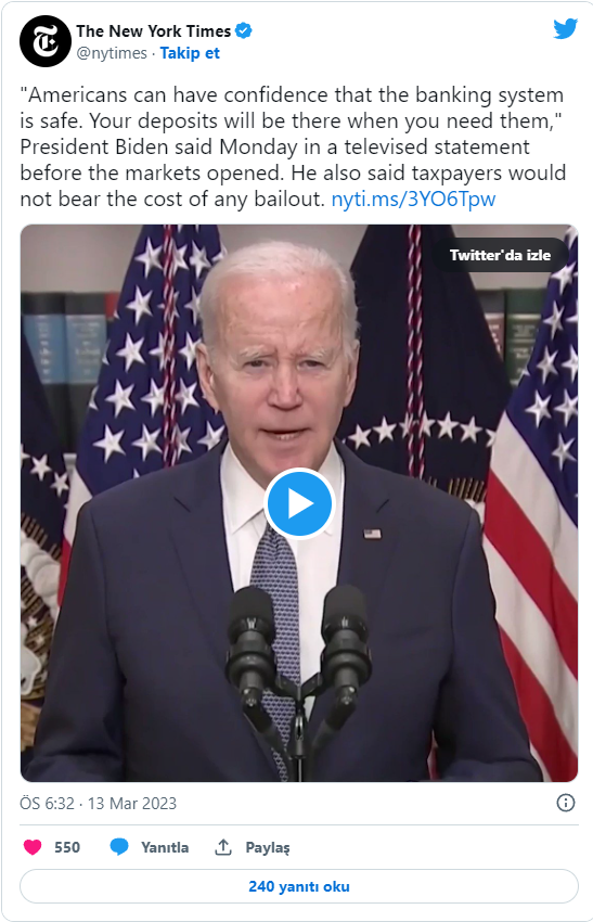 Banka iflaslarının faturasının vergi mükelleflerine kesilmeyeceği iddiasını tekrarlayan Biden, "Federal hükümet, SVB mudilerinin paralarını geri almalarını sağlarken, zarar vergi mükellefleri tarafından karşılanmayacak.