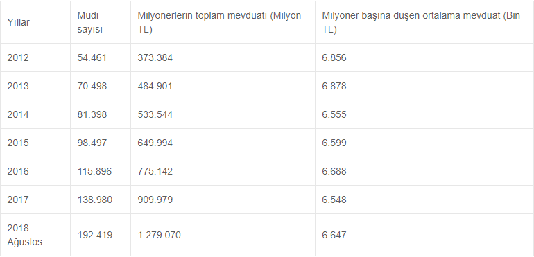 Yıllara göre, hesabında 1 milyon lira ve üzeri bakiye olan mudi sayısı, toplam mevduatları ve milyoner başına düşen ortalama mevduat tutarı şöyle: