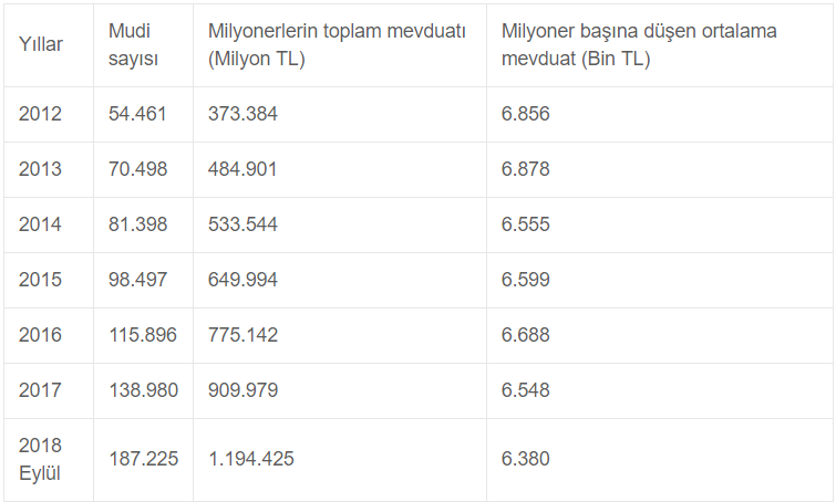 Söz konusu milyonerlerin toplam mevduatı eylül sonu itibarıyla 1 trilyon liranın üzerine çıkarak 1 trilyon 194 milyar 425 milyon liraya ulaştı. Böylece milyoner başına düşen ortalama mevduat, 6 milyon 380 bin lira oldu.