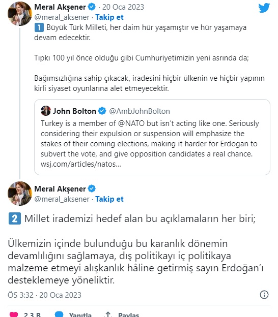 Türkiye'nin NATO üyesi olduğunu ancak buna uygun davranmadığını öne süren Bolton, "Türkiye'nin NATO'dan ihraç edilmesini veya üyeliğinin askıya alınmasını ciddi bir şekilde tartışmanın; Erdoğan'ın seçime müdahale etmesini zorlaştıracağını ve muhalefete gerçek bir şans vereceğini" ifadelerini kullanmıştı.