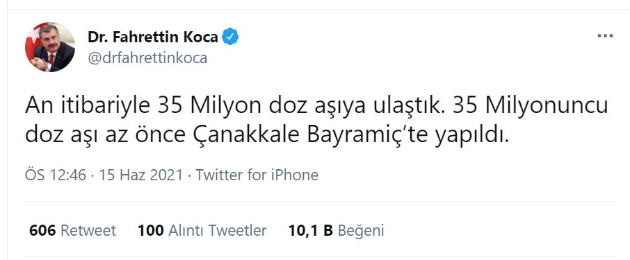 Türkiye’de her geçen gün ivme kazanan aşılanmayla birlikte düşen vaka sayısının ardından bugün Sağlık Bakanı Dr. Fahrettin Koca müjdeli haberi Twitter hesabından duyurdu. Bakan Koca yaptığı paylaşımda, “An itibariyle 35 Milyon doz aşıya ulaştık. 35 Milyonuncu doz aşı az önce Çanakkale Bayramiç’te yapıldı” ifadelerine yer verdi.