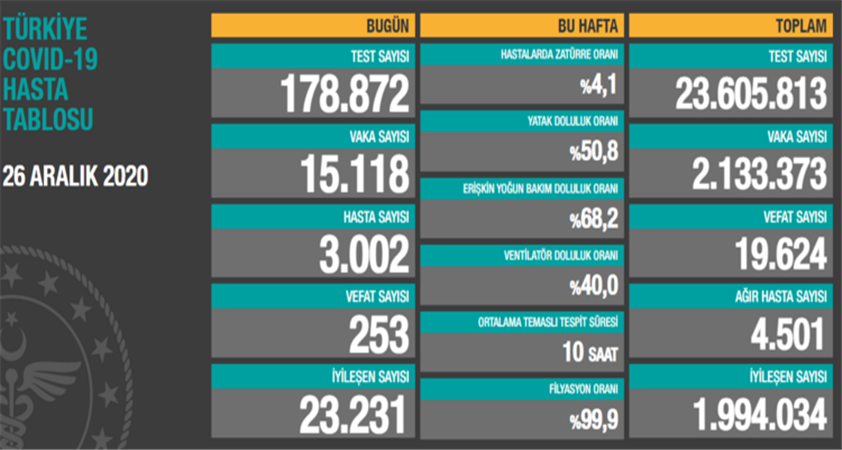 Türkiye'de son 24 saatte 178 bin 872 Kovid-19 testi yapıldı, 15 bin 118 kişinin testi pozitif çıktı, 253 kişi hayatını kaybetti.