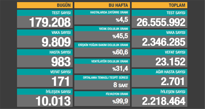 Türkiye'de son 24 saatte 179 bin 208 Kovid-19 testi yapıldı, 9 bin 809 kişinin testi pozitif çıktı, 171 kişi hayatını kaybetti.