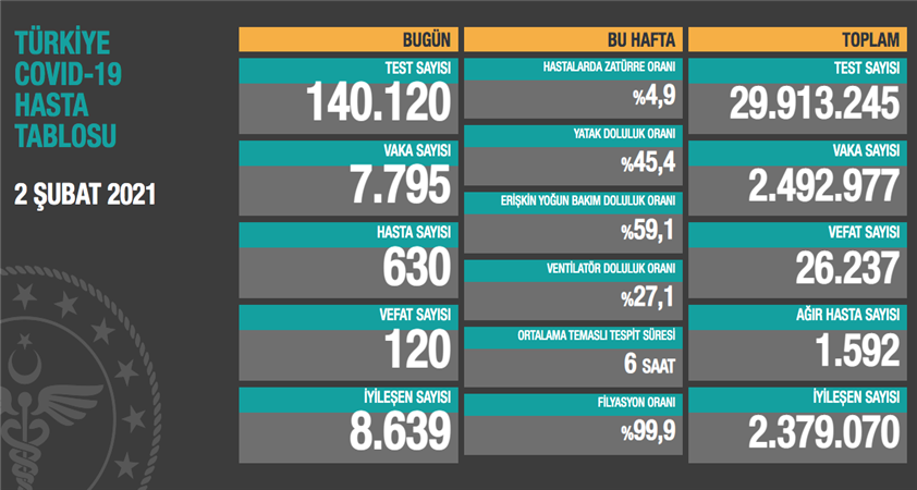 Türkiye'de de Kovid-19 tespit edilen 2 milyon 379 bin 70 kişi sağlığına kavuştu.