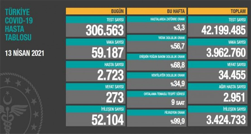 Türkiye'de son 24 saatte 306 bin 563 Kovid-19 testi yapıldı, 59 bin 187 kişinin testi pozitif çıktı, 273 kişi hayatını kaybetti.