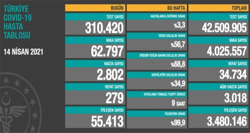 Türkiye'de son 24 saatte 310 bin 420 Kovid-19 testi yapıldı, 62 bin 797 kişinin testi pozitif çıktı, 279 kişi hayatını kaybetti.