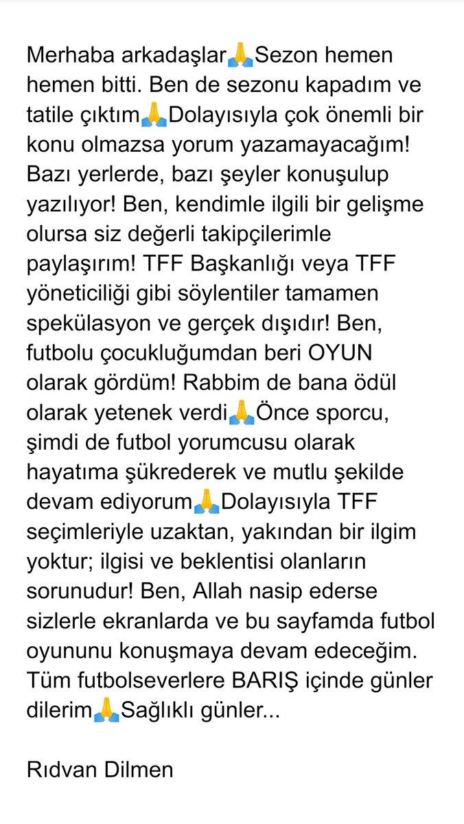 "Merhaba arkadaşlar sezon hemen hemen bitti. Ben de sezonu kapadım ve tatile çıktım. Dolayısıyla çok önemli bir konu olmazsa yorum yazamayacağım! Bazı yerlerde, bazı şeyler konuşulup yazılıyor! Ben, kendimle ilgili bir gelişme olursa siz değerli takipçilerimle paylaşırım! TFF Başkanlığı veya TFF yöneticiliği gibi söylentiler tamamen spekülasyon ve gerçek dışıdır! Ben, futbolu çocukluğumdan beri oyun olarak gördüm! Rabbim de bana ödül olarak yetenek verdi. Önce sporcu, şimdi de futbol yorumcusu olarak hayatıma şükrederek ve mutlu şekilde devam ediyorum. Dolayısıyla TFF seçimleriyle uzaktan, yakından bir ilgim yoktur; ilgisi ve beklentisi olanların sorunudur! Ben, Allah nasip ederse sizlerle ekranlarda ve bu sayfamda futbol oyununu konuşmaya devam edeceğim. Tüm futbolseverlere barış içinde günler dilerim. Sağlıklı günler."