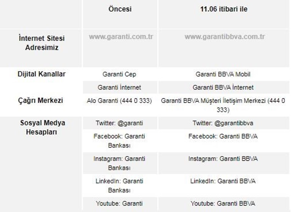 "9 yıldır bünyesinde bulunduğumuz BBVA Grubu’nun tüm dünyada uyguladığı dijital dönüşüm stratejisi kapsamında, BBVA’nın global marka gücünü Garanti marka ve logosunun yanına ekliyor ve 11 Haziran’dan itibaren Garanti BBVA ismini kullanmaya başlıyoruz. Garanti BBVA olarak her zaman olduğu gibi bundan sonra da, ülkemiz ekonomisine değer katmaya ve çağın fırsatlarını herkese sunmak için çalışmaya devam edeceğiz."