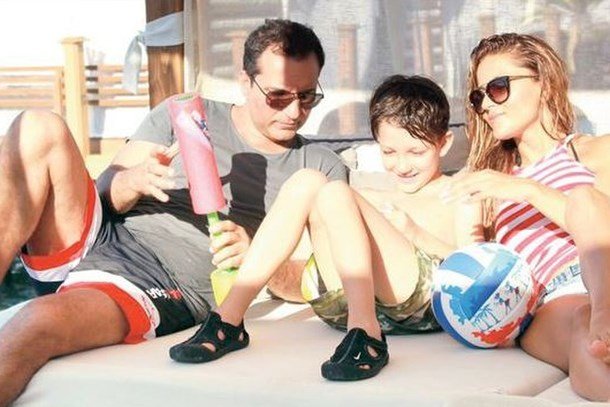 Oğullarını da alarak Kıbrıs'ta tatile çıkan ikili, önceki gün kaldıkları otelin plajında görüntülendi.