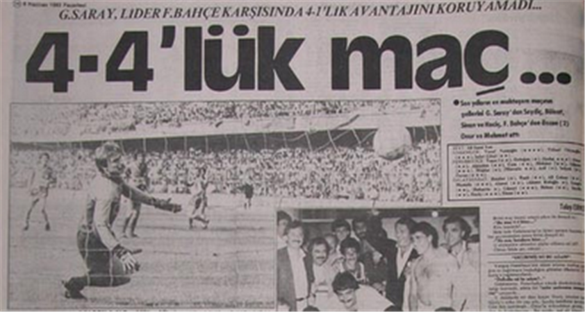 5 Haziran 1983 Ali Şen soyunma odasına inmiş, futbolcularına "Başarınız galibiyetten de büyüktür" diyordu. Ali Şen gibi iddialı bir ismin galibiyetten öte gördüğü beraberliğin ardındaysa 48. dakikada 4-1 yenik duruma düşen takımının skoru 4-4-'e getirmesi yatıyordu. Fener tribünleri maç öncesinde sarı kırmızı tabutu elleri üzerinde, cenaze marşı eşliğinde gezdirmişti: bu şamatanın yeriniyse 48. dakikada Galatasaraylılar'ın "Tabelaya bakalım, göbek atalım" tezahüratı almıştı. Kimsenin cenazesi kalkmadı, kimse göbek atmadı ama Fenerbahçe son iki haftaya Trabzonspor'un iki puan önünde girmenin ve ezeli rakibine yenilmemenin mutluluğunu yaşadı.