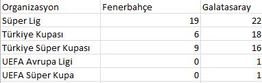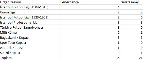 İki takım, Türkiye'de günümüzde de devam eden üç resmî organizasyonun en eskisi olan Süper Lig'de 124 maç oynadı. Bu maçların 50'sini Fenerbahçe, 33'ünü Galatasaray kazanırken, 41 maç berabere sonuçlandı. Türkiye Kupası'nda oynadıkları 26 maçın 13'ünü Galatasaray, 3'ünü Fenerbahçe kazanırken, 10 maç beraberlikle sona erdi. İki takım 5 kere Türkiye Kupası finalinde karşı karşıya gelirken Galatasaray, bu finallerin tamamından kupayla ayrılan taraf oldu. Türkiye Süper Kupası'nda ise 6 maç oynayan iki takım da bu finallerden üçer kez şampiyonlukla ayrıldı.