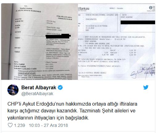 Albayrak, Twitter hesabından, "CHP'li Aykut Erdoğdu'nun hakkımızda ortaya attığı iftiralara karşı açtığımız davayı kazandık. Tazminatı şehit aileleri ve yakınlarının ihtiyaçları için bağışladık." paylaşımında bulundu.