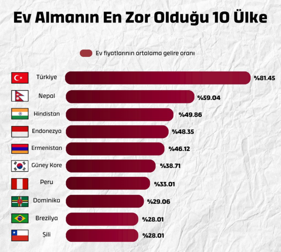 Erdursun’un aktardığına göre satın alma gücünde yaşanan düşüş Türkiye’yi dünya genelinde ise zirveye taşıdı. Buna göre Türkiye, Nepal, Hindistan ve Endonezya gibi ülkeleri geride bırakarak dünyada ev sahibi olmanın en zor olduğu ülke oldu.