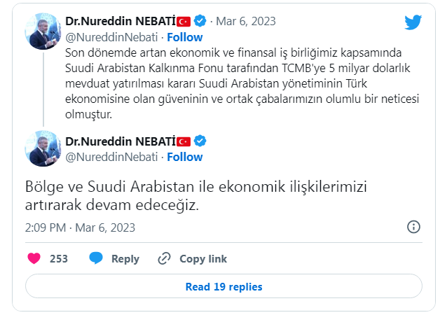 Kararın önemine işaret eden Nebati, şunları kaydetti: "Son dönemde artan ekonomik ve finansal işbirliğimiz kapsamında Suudi Arabistan Kalkınma Fonu tarafından TCMB'ye 5 milyar dolarlık mevduat yatırılması kararı, Suudi Arabistan yönetiminin Türk ekonomisine olan güveninin ve ortak çabalarımızın olumlu bir neticesi olmuştur. Bölge ve Suudi Arabistan ile ekonomik ilişkilerimizi artırarak devam edeceğiz."