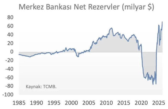 Prof. Dr. Ali Hakan Kara, “Merkez Bankası net rezervleri 70,5 milyar dolar ile tarihi zirveye ulaştı” derken, grafiği de paylaştı: