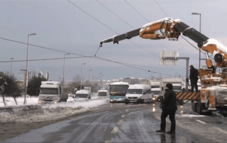 İstanbul Küçükçekmece’de kar ve şiddetli fırtına nedeniyle yüksek gerilim hattı E-5’e devrildi. Yol bir süre trafiğe kapalı kaldı.