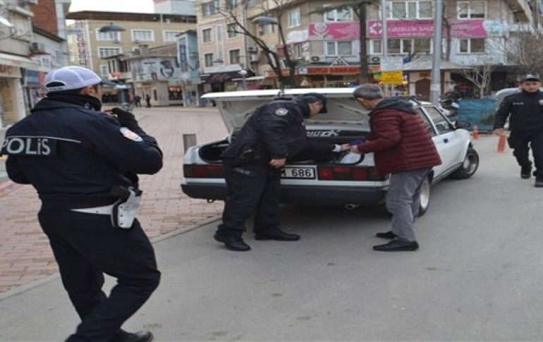 İnegöl'de de ekipler sabah göreve başladı. Yapılan uygulamalara narkotik köpeği de katılarak araçları didik didik aradı.