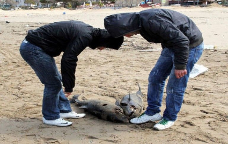 Bartın'ın İnkum tatil köyünde onlarca yunus balığı ölü halde karaya vurdu. Yunus balıklarının sırtlarındaki kurşun delikleri, yunusların katledildiğini ortaya çıkarttı