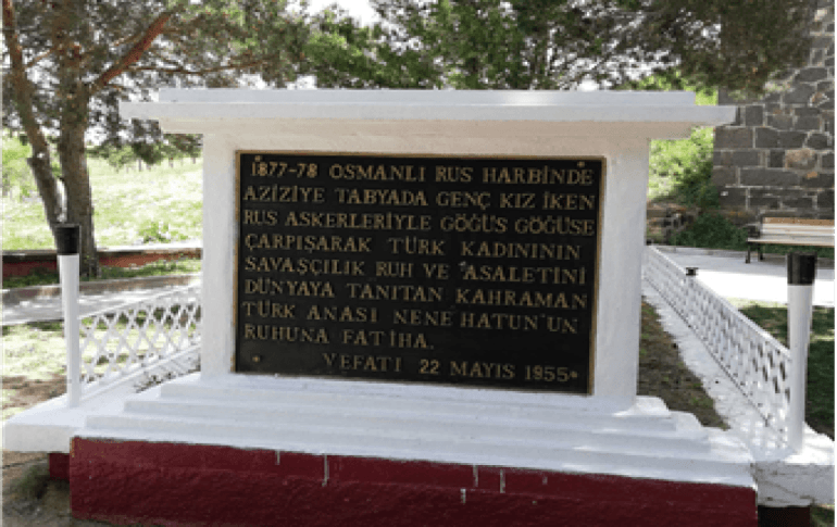 Tarihte 93 Harbi olarak anılan 1887-88 Osmanlı-Rus Savaşı sırasında tarihe adını yazdıran ve o sırada henüz 20 yaşlarında olan Nene Hatun, Rusların Erzurum’da Aziziye Tabyası’nı ele geçirmesi üzerine, küçük yaştaki oğlunu ve üç aylık bebeğini geride bırakıp, şehit olan ağabeyinin silahını almış ve “Bebem anasız büyür de, vatansız büyüyemez.” diyerek cepheye koşmuş ve vatan savunmasında bulunmuştur.
