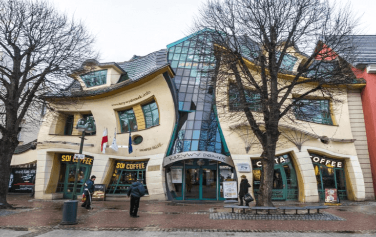 Polonya'nın Sopot şehrinde bulunan Çarpık Ev. 2004'te inşa edilen ve yaklaşık 4000 m2'ye yayılan ve dekonstrüktivizm stilinde tasarlanmış bir yapı, Rezydent adındaki bir alışveriş merkezinin bir parçası olarak hizmet vermektedir.