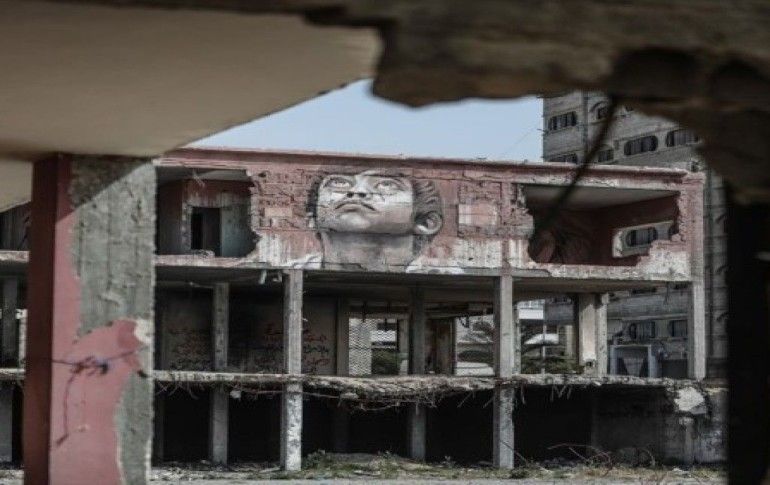 Filistinli sanatçı Ali el-Cibali, İsrail'in Gazze'ye 2014 yılında düzenlediği saldırılarda zarar gören binaların enkazında eserlerini sergiliyor.