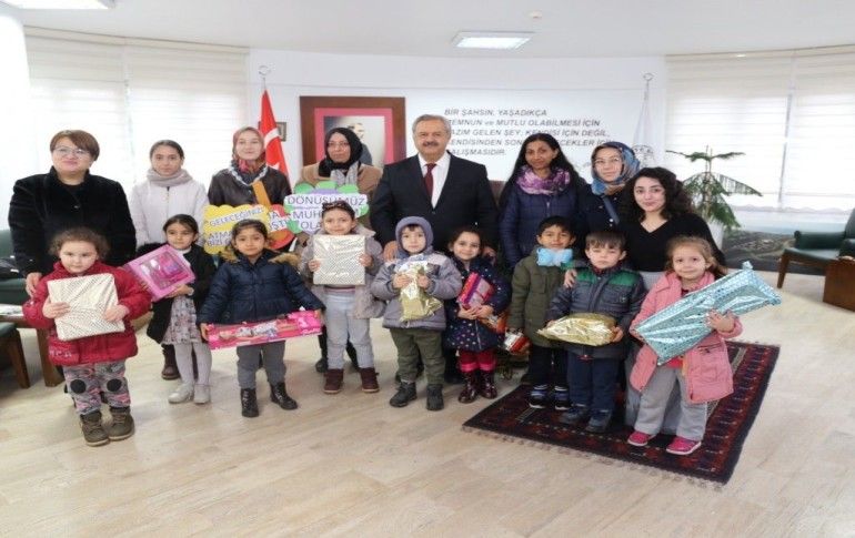 Oyuncaklarını alan minik öğrenciler, Başkan Uysal’a teşekkür etti.