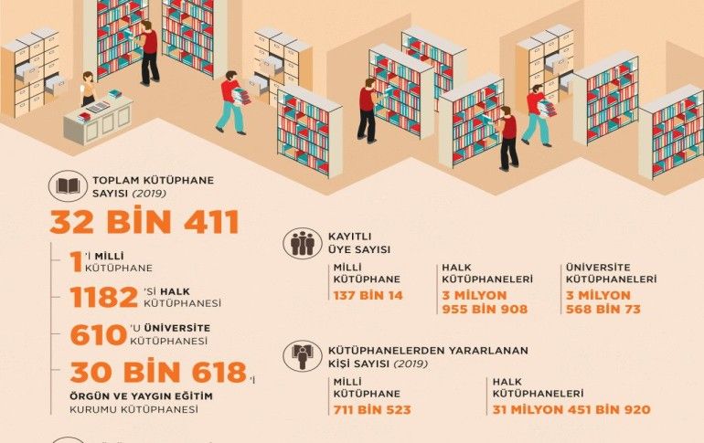 Türkiye'de 2019 yılı itibarıyla 32 bin 411 kütüphane faaliyet gösteriyor. Milli Kütüphaneden yararlananların sayısı geçen yıl bir önceki yıla göre yüzde 12,2 arttı.