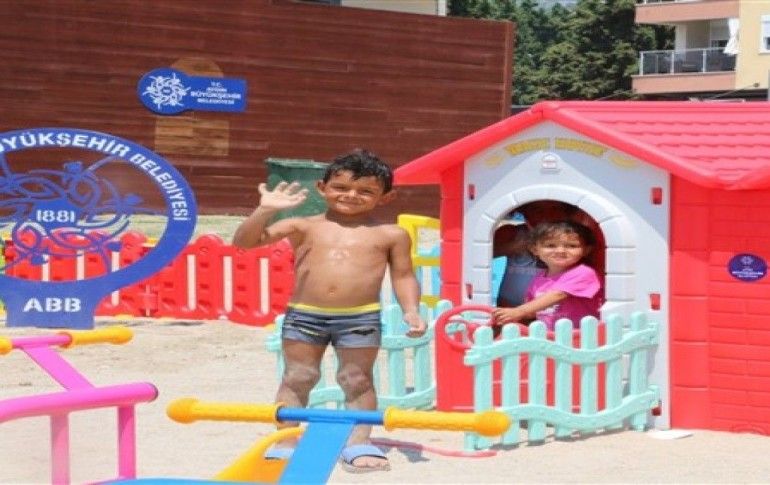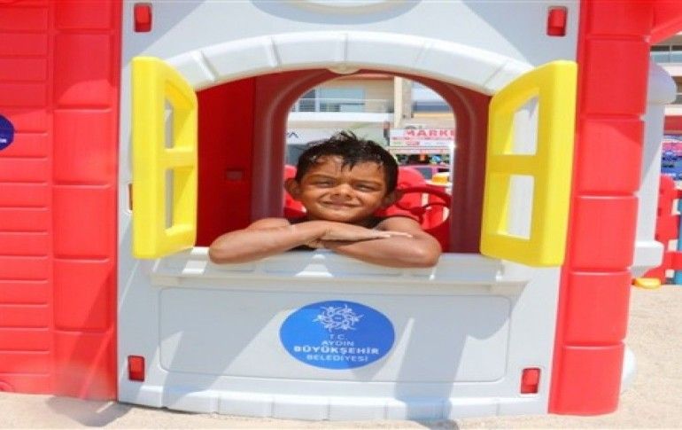Kuşadası Marina'nın yanındaki Aydın Büyükşehir Belediyesi'ne ait plajda yapılan düzenlemeyle çocuklar oyun alanında gönüllerince eğleniyor. Oyun alanı kurulduğu ilk günden dolup taşmaya başladı.