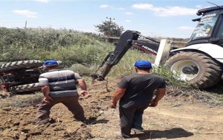 Şans eseri kazayı ucuz atlatan çiftçi Ersan, çağırdığı kepçe yardımıyla traktörünü kurtardı.