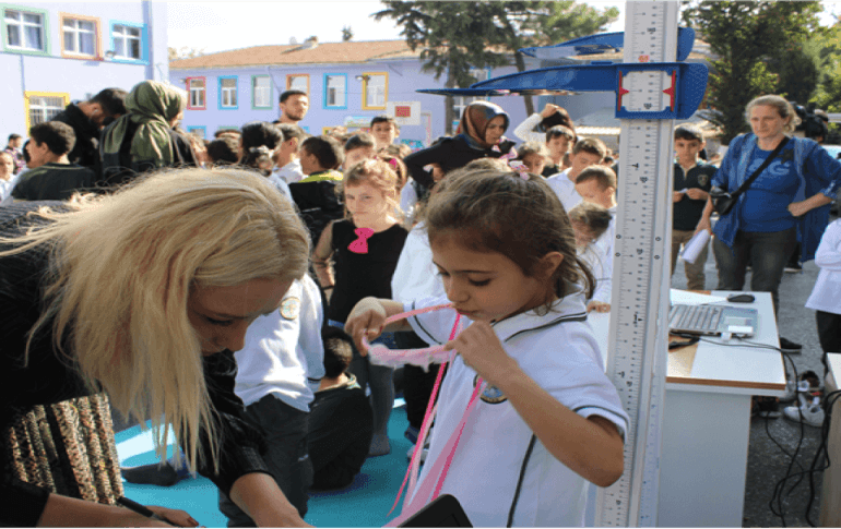 Uzman diyetisyenler ile vücut kitle indeksi ölçüm cihazlarının bulunduğu karavanın ilk durağı Rami Yeni Mahalle Tantavi İlkokulu oldu. Okul bahçesinde bekleyen öğrenciler belediyenin Sağlıklı Yaşam Karavanı’nda tartılarak, boy ve kilo ölçümlerini yaptırdı. Kilo fazlası olan ve risk grubuna giren öğrencilere randevu verilerek Eyüpsultan Belediyesi Sosyal Destek Hizmet Müdürlüğü’ndeki diyet bölümüne yönlendirildi. Burada kişiye özel diyet listeleri hazırlanarak ilçedeki obezitenin önlenmesi, sağlıklı yaşam, doğru beslenme konularında bilgilendirme yapılmasının yanı sıra diyetisyene gidemeyen vatandaşlara bu konuda ücretsiz destek olunması amaçlandı. Öte yandan Eyüpsultan Belediye Başkanı Deniz Köken’e çocuklar yoğun ilgi gösterdi.