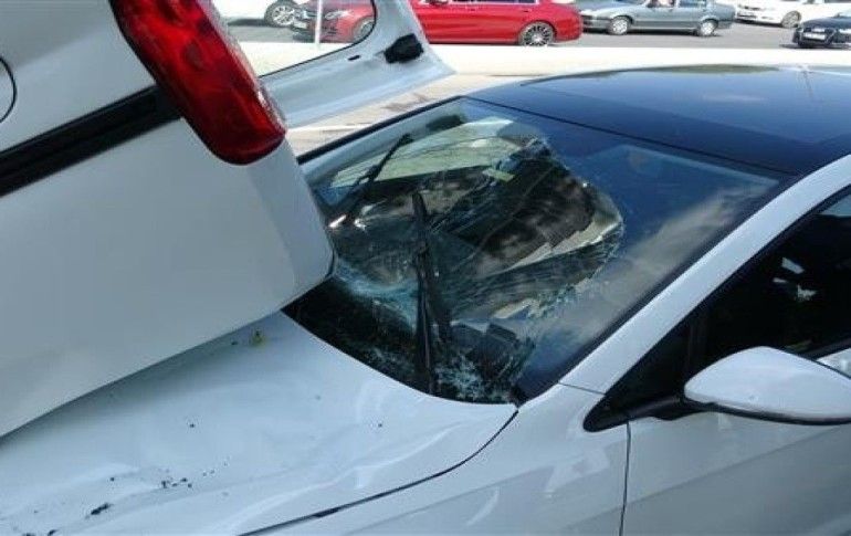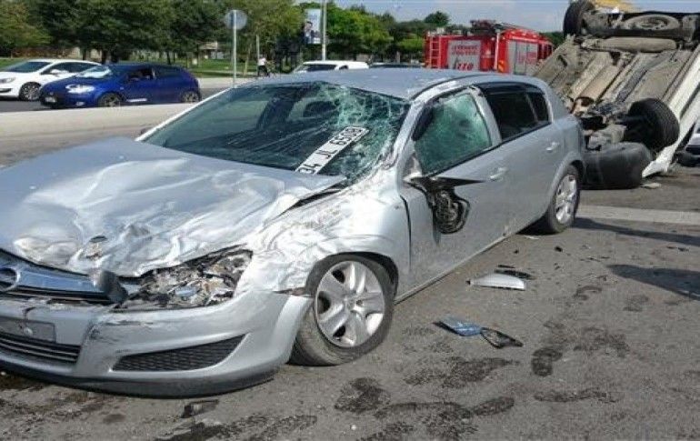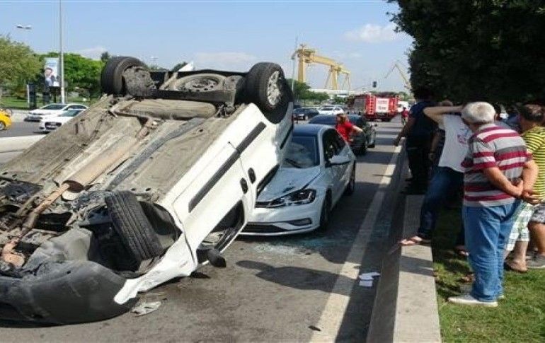 Takla atan araç karşı şeride uçarak bir otomobilin üzerine düştü. Görenleri şaşkına çeviren kazada iki kişi yaralandı.