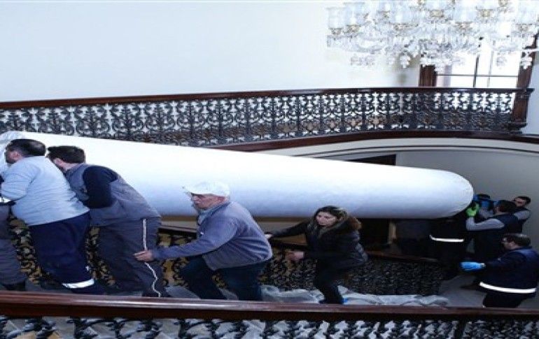 İSTANBUL / AA - Fransız ressam Felix-Auguste Clement'e ait 35 metrekarelik devasa tablo, 3 aylık bir çalışma yapan ve nakliyenin her aşamasını onlarca kez prova eden Milli Saraylar ekibince, önce rulo halinde, ahşap koruma sandığı içerisine büyük bir titizlikle yerleştirildi.
