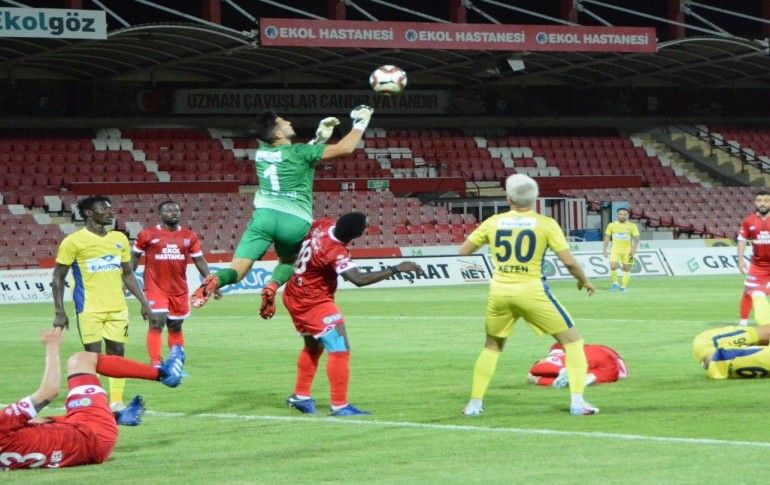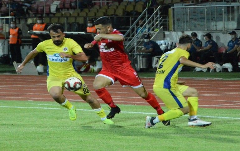 TFF 1. Lig'de 29. hafta maçında Ekol Hastanesi Balıkesirspor, Ekol Göz Menemenspor ile Balıkesir Atatürk Stadı'nda karşılaştı. Bir pozisyonda Ekol Hastanesi Balıkesirspor futbolcusu Berat Aydoğlu (sağda), Ekol Göz Menemenspor futb...
