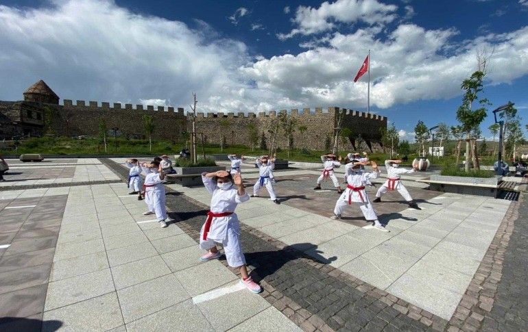 Gençlik ve Spor Bakanlığı Spor Hizmetleri Genel Müdürlüğünün "Spor Her Yerde" projesi kapsamında Erzurumlu karateci ve tenisçiler, Kale Kent Meydanında maske takıp sosyal mesafe kuralına uyarak gösteri yaptı.