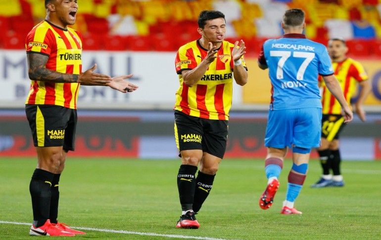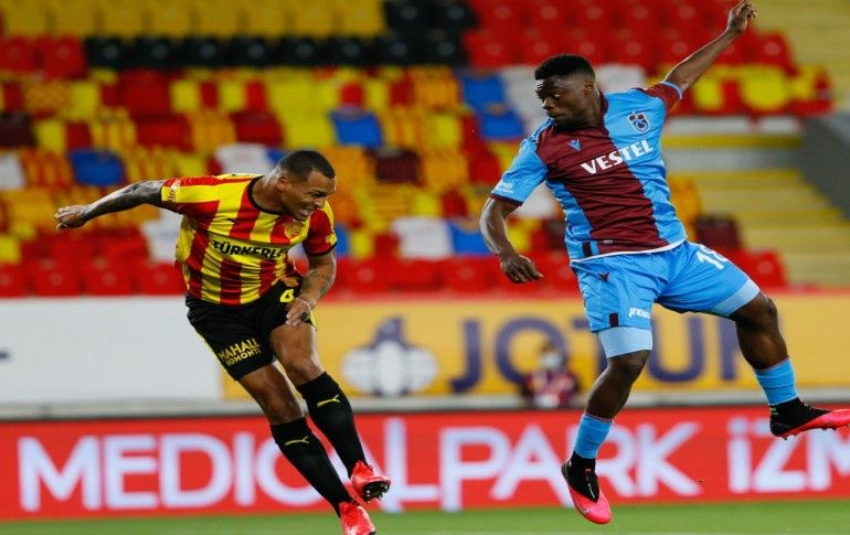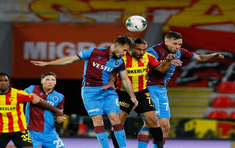 Süper Lig'in 27. haftasında Göztepe ve Trabzonspor takımları Gürsel Aksel Stadında karşılaştı. Göztepe'den Halil Akbunar (ortada) bir pozisyonda Trabzonspor'dan Filip Novak (sağda) ve Abdulkadir Parmak (solda) ile mücadele etti.