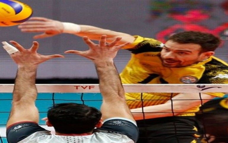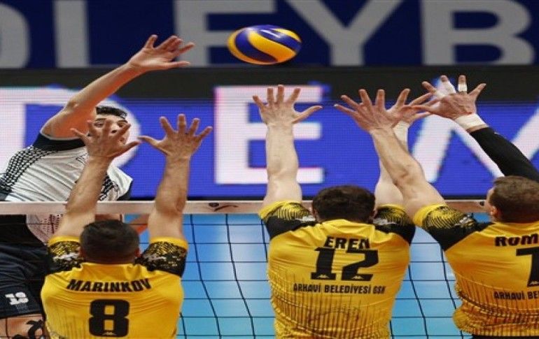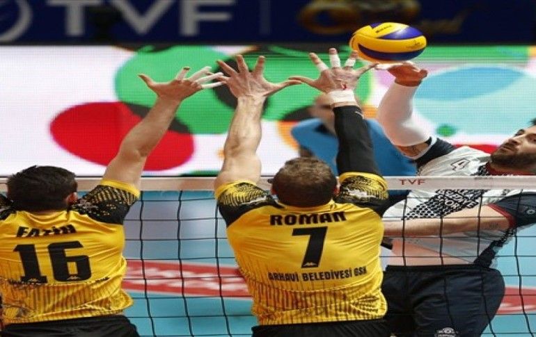 Bir pozisyonda Arhavi Belediyespor voleybolcuları Dimitar Marinkov, Eren Uğur ve Dan Rom, Jeopark Kula Belediyespor voleybolcusu Vladimir Jekic ile mücadele etti.