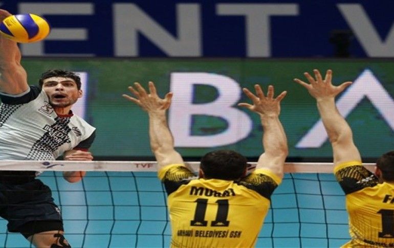 Bir pozisyonda Arhavi Belediyespor voleybolcuları Murat Karakaya ve Fatih Cihan, Jeopark Kula Belediyespor voleybolcusu Vladimir Jekic ile mücadele etti.