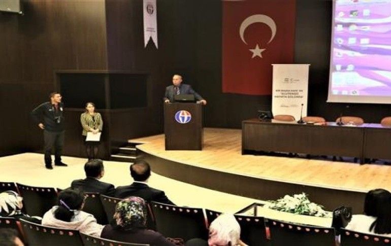 Gaziantep Üniversitesi Tıp Fakültesi Hastanesi Oditoryumu’nda gerçekleştirilen seminer öncesi, Büyükşehir Belediyesi’ne bağlı Glutensiz Bir Başka Kafe çalışanları, işaret dilinde İstiklal Marşı sundu, kafenin tanıtımına yönelik kısa bir film izlendi.