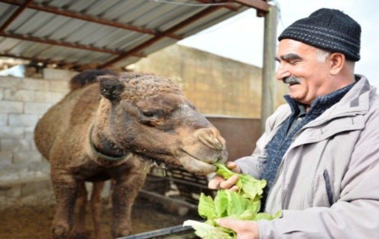 Mardin'de Suriye sınırındaki köyde yaşayan 7 çocuk babası Mehmet Nezir Aydın, yavruyken aldığı "Badem" ve "Sakız" ismini verdiği develerini elleriyle besleyip, günlük bakımlarını yapıyor.