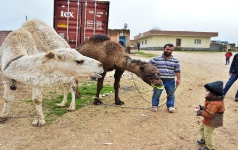 Mardin'in Kızıltepe ilçesinin Suriye sınırındaki Aşağı Hatunlu köyünde yaşan çiftçi Mehmet Nezir Aydın, yavruyken aldığı 2 deveye çocukları gibi bakıyor.
