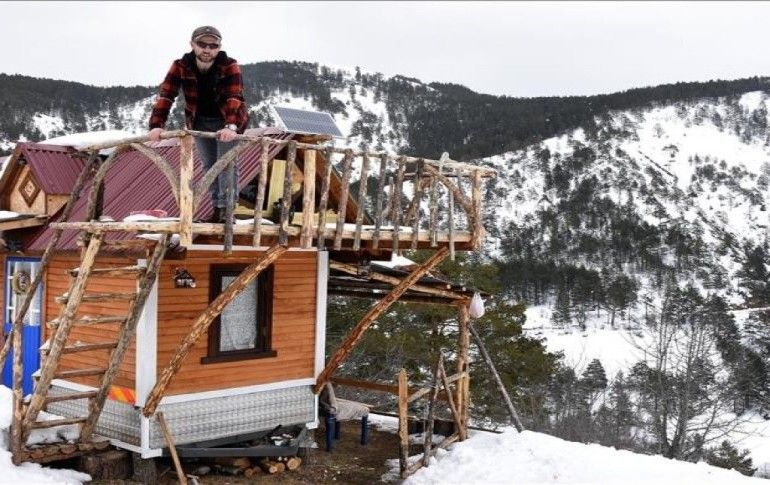 Karavanla karlı doğada dingin bir yaşamın tadını çıkaran 38 yaşındaki Coşkun, zaman zaman misafir de ağırlıyor.