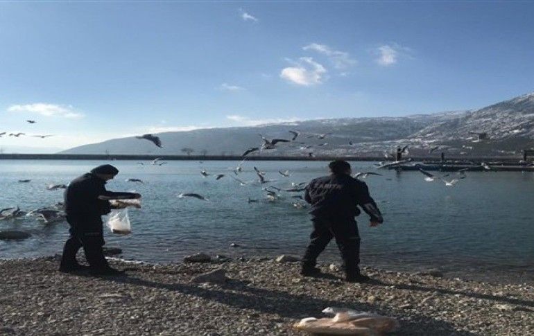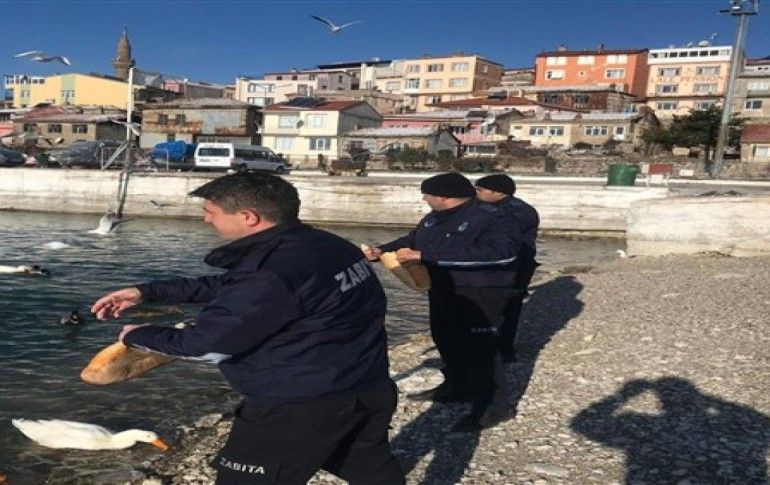Eğirdir Belediyesi Zabıta Müdürlüğü ekipleri kış şartlarında yiyecek bulmakta zorlanan sokak hayvanlarını ve göl hayvanlarını besledi.