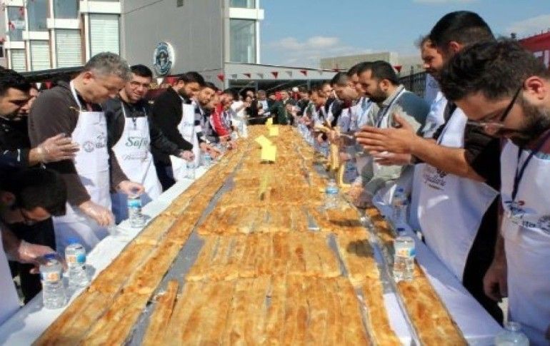 Bursa'da düzenlenen '5'inci Börek Festivali' renkli görüntülere sahne oldu. Hasan Usta İkizler Börek’in 12'nci şubesi’nin açılışında düzenlenen festivalde, en uzun börek yarışması yarışmacılara zor anlar yaşattı. Hakemlerin gözetiminde 10 dakika süren yarışmada 10 metre uzunluğunda böreği yiyerek birinci olan Orhan Zeydan, 1500 lira hediye çeki ve 2 çeyrek altın kazandı.