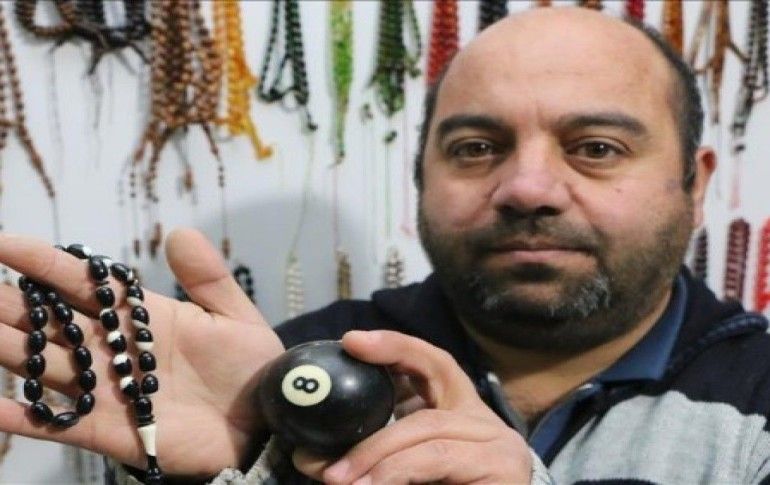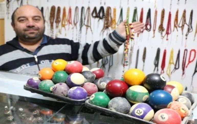 Aksaray'da yaşayan Ercan Yıldırım'ın atölyesinde eski bilardo toplarını belirli işlemlerden geçirerek, Süper Lig takımlarının renklerinden yaptığı "taraftar tespihleri" ilgi görüyor .