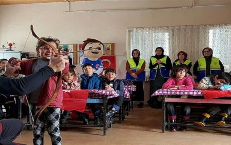 Geleneksel okçuluk antrenörleri ile çocuklara ok atmayı da öğreten gençler, öğrencilere "genç dönüşüm projesi" kapsamında topladıkları kalem, silgi ve çeşitli kırtasiye malzemelerini, okula da bilgisayar hediye etti.