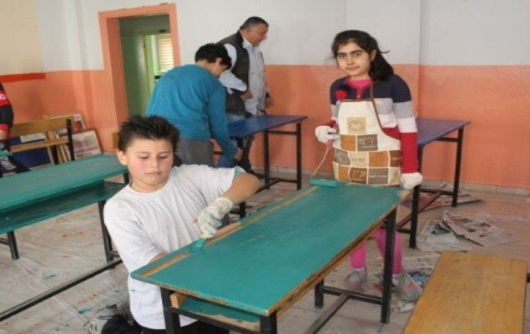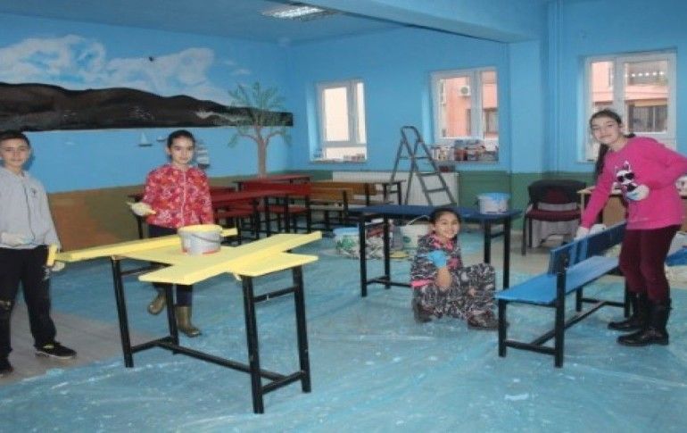 Öğrenciler, 5'er kişilik gruplara ayrılarak sıraları farklı renklerde boyadı. Ressam Kayhan Yıldırım da sınıfın duvarlarına hayvan ve doğa resimleri çizdi.