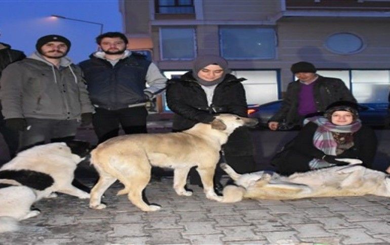 Kafkas Üniversitesinde (KAÜ) öğrenim gören bir grup öğrenci ile esnaf, Kars'ta etkili olan soğuk hava nedeniyle sokakta aç kalan köpekler için seferber oldu.