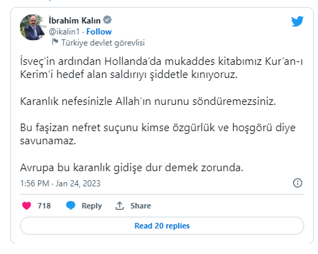 İsveç'in ardından Hollanda'da da yaşanan saldırıyı da şiddetle kınadıklarını vurgulayan Kalın, "Karanlık nefesinizle Allah'ın nurunu söndüremezsiniz. Bu faşizan nefret suçunu kimse özgürlük ve hoşgörü diye savunamaz. Avrupa bu karanlık gidişe dur demek zorunda." değerlendirmesinde bulundu.