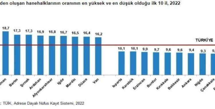 Adrese Dayalı Nüfus Kayıt Sistemi (ADNKS) sonuçlarına göre, Türkiye’de 2008 yılında 4 kişi olan ortalama hanehalkı büyüklüğünün, azalma eğilimi göstererek 2022 yılında 3,17 kişiye düştüğü görüldü. TUIK verilerine göre, Türkiye’de 2022 yılında ortalama hanehalkı büyüklüğünün en yüksek olduğu il, 4,91 kişi ile Şırnak olurken Eskişehir’de hanehalkı büyüklüğü 2,73 kişinin altında kaldı. Şırnak ilini 4,81 kişi ile Şanlıurfa ve 4,67 kişi ile Batman izledi. Ortalama hanehalkı büyüklüğünün en düşük olduğu illerin ise 2,54 kişi ile Tunceli ve Çanakkale olduğu açıklandı. TUIK tarafından yayınlanan verilere göre, geniş aileden oluşan hanehalklarının oranının en düşük olduğu il, yüzde 8,6 ile Eskişehir oldu. Bu oranın en yüksek olduğu ilin ise yüzde 20,5 ile Hakkari olduğu açıklandı. Hakkari ilini yüzde 18,7 ile Batman, yüzde 17,3 ile Bartın ve Şırnak izledi.